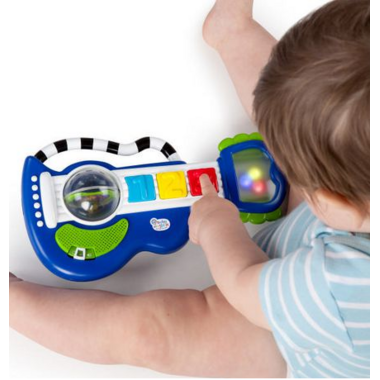 Now baby can rock out to classical melodies with this adorable guitar! The Baby Einstein™ Rock, Light & Roll Guitar™ entertains baby with 10 classical melodies, flashing lights and more. Spin the rattle ball to hear melodies and activate lights or press one of the 3 color buttons to activate shorter melodies and lights.