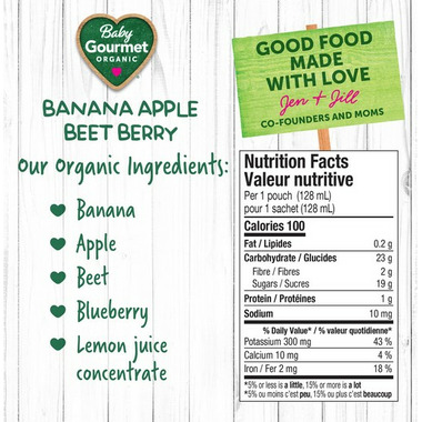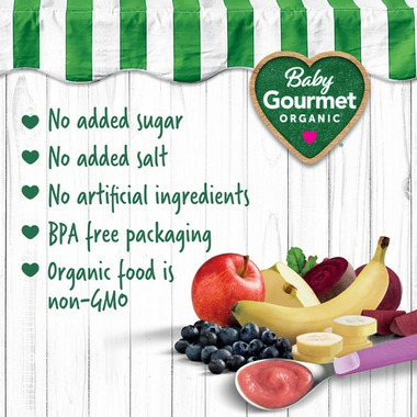 Baby Gourmet Banana, Apple and Beat Berry is ready made organic baby food.