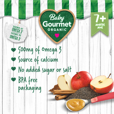 Baby Gourmet Baked Apple, Cinnamon and chia is ready made organic baby food plus Omega-3.