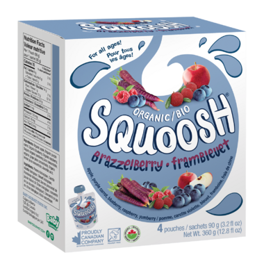 Baby Gourmet Squoosh Brazzleberry is made with apple, blueberry, raspberry, purple carrot and yumberry.