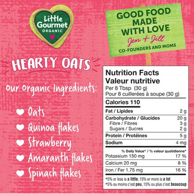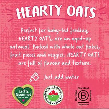 Baby Gourmet Strawberry Spinach Oatmeal Hearty Bowls made with organic oat flakes and fruit pieces with quinoa and amaranth. Perfect for baby led feeding, Baby Gourmet Hearty Bowls are an aged up oatmeal. Packed with whole at flakes, fruit pieces and veggies, Hearty Bowls are full of flavour and texture. Just add water!