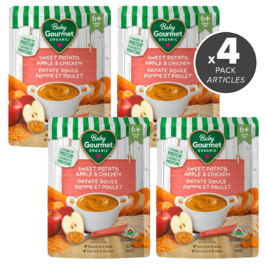 x4 Baby Gourmet Sweet Potato, Apple & Chicken Baby Food (128mL): Baby Gourmet Sweet Potato, Apple and Chicken organic baby food made with only 3 grams of protein and perfect for babies 6+ months.