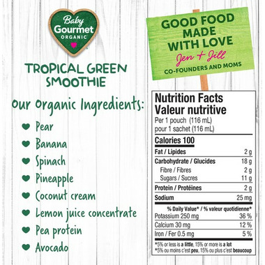 Baby Gourmet Plus Tropical Green Smoothie is ready made organic baby food plus plant based nutrition.