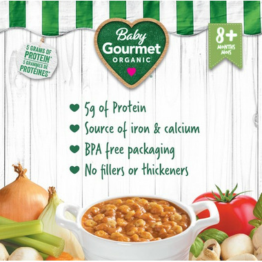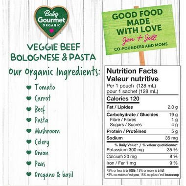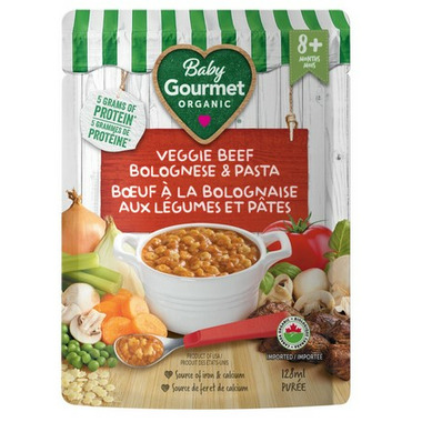Baby Gourmet Veggie Beef Bolognese and Pasta Stars organic baby food made with only 5 grams of protein and perfect for babies 8+ months.