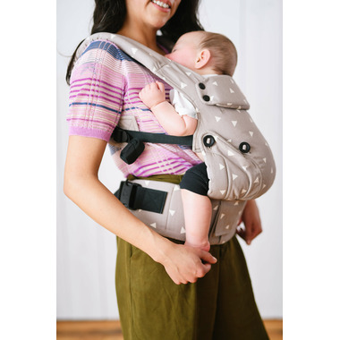 A sprinkle of Tula sleepy dust means restful rides in your carrier! “Sleepy Dust” is a stylish neutral design with off-white triangles sprinkled across a soft taupe background. The pattern continues across the inner shell of the carrier, straps, waist belt and the detachable hood.