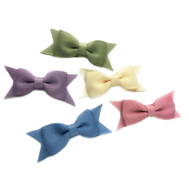 5 adorable tiny baby hair bows in grosgrain ribbon on snap clips. Sweep fringe away out of baby's eyes! Pretty colors to coordinate with baby's stylish outfits.