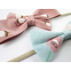 - 1 Aqua blue with ivory and warm blush floral print bow in a tuxedo style
