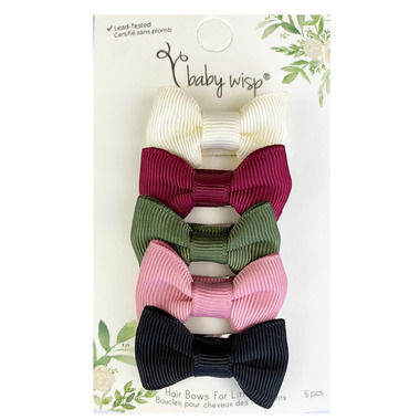 5 adorable baby hair bows in grosgrain ribbon on snap clips. Sweep fringe away out of baby's eyes! Pretty colors to coordinate with baby's stylish outfits.