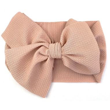 Adjustable Large Bow Headband for Girls with an Over Sized Bow Knot. This fabric is a blend of polyester, cotton and spandex. It creates an impactful giant bow look with a really wide headwrap. Many customers who want a Big Bow Headwrap or Over Sized Bow Head wraps love these. The fabric is soft with approximately a 6" bow and is 4.5"-5" wide. The fabric has a little stretch with no sew, raw edges. Pre-tied but it can be untied and retied as needed for a variety of styles or to adjust for the proper fit.