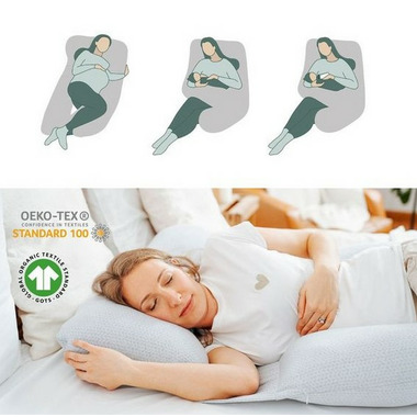 This XXL pillow wraps around your body for maximum comfort. It surrounds you with a cloud of softness, supports your back, relieves your bump and places your legs in a comfortable position. Its even, high density filling combined with its Oeko-Tex certified fabric mean you get a great night's sleep. And to ensure you are even more comfortable when resting, we have created two flat sections (non-padded) on each side of the pillow so you can place your arms under or over the pillow, without feeling restricted.