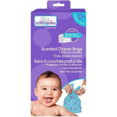 Baby Works™ Scented Diaper Bags provide a convenient solution for soiled diapers, training pants, soiled clothing and many other uses while on-the-go! The baby powder scented bags help neutralize unpleasant odors while the hygienic easy tie handles are perfect for mess-free diaper disposal. Each bag has enough capacity for a diaper and the wipes, making change time more convenient, easier and cleaner! This value pack size comes with four individual packages of 50 bags which are perfect for throwing in the purse or diaper bag.