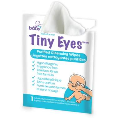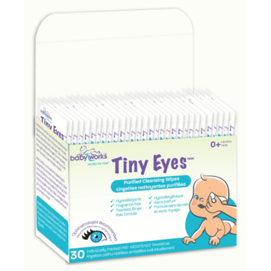 Relief from clogged tear ducts, styes, pink eye, scales, redness and itchiness: While many babies get clogged tear ducts and other ocular ailments, daily use of the Baby Works? Tiny Eyes? Baby Purified Cleansing Wipes can help prevent infection, irritation and conjunctivitis by keeping the delicate area around baby?s eyes clean.