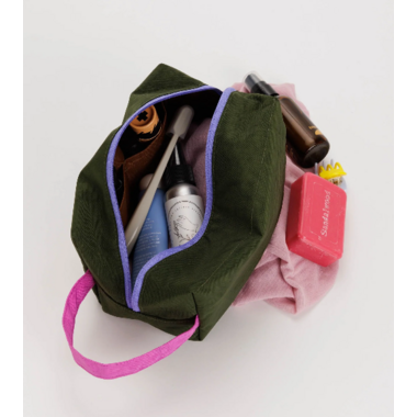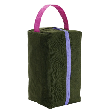 Includes a zip top closure and three interior pockets with a loop for carrying or hanging. Made from Recycled heavyweight nylon. Machine washable.