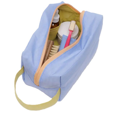 This Dopp Kit has a zip top closure with three interior pockets, and a
