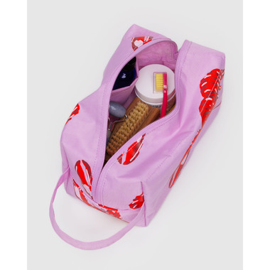 Dopp Kit has a zip top closure with three interior pockets, and a loop