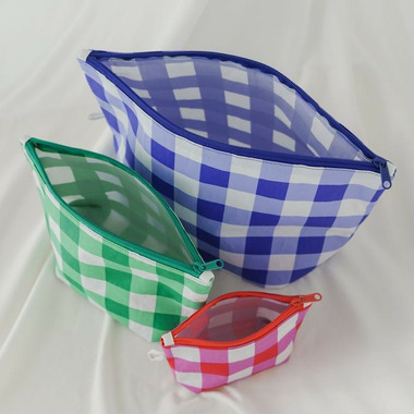 A set of three all purpose zip pouches for organization and travel. Gusseted pouches lay flat or expand to hold your daily essentials. Medium pouch holds a small tablet/e-reader. Large pouch holds an tablet or a 12 inch laptop.