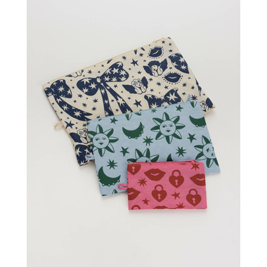 A set of three all-purpose zip pouches. Ideal for travel, organization, and storage.