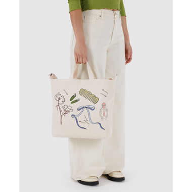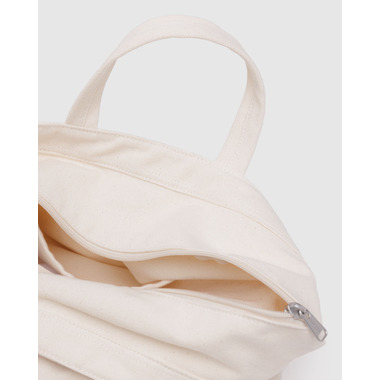 An updated version of BAGGU's Horizontal Duck Bag, now with a zip top closure to keep your belongings nice and secure. Fits a 15 inch MacBook and has an interior patch pocket. Made from 16 oz recycled cotton canvas. Machine washable.