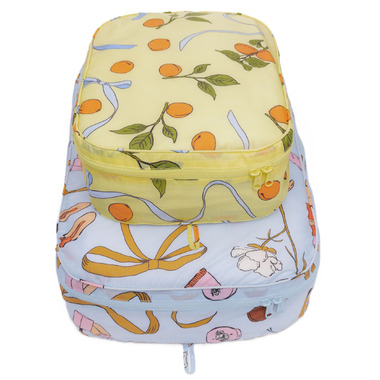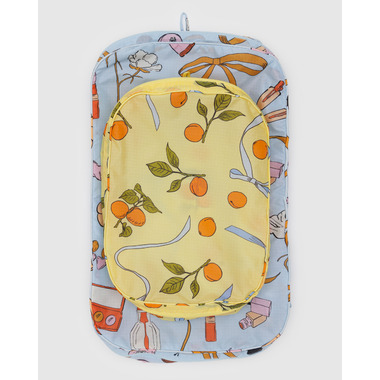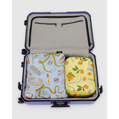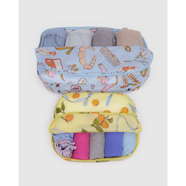 BAGGU's travel-ready packing cubes come in a larger size to wrangle the biggest items on your packing list. Fits perfectly inside the Travel Cloud Bag or Cloud Carry On. This set includes 1 Medium and 1 Large packing cube. They are made of recycled ripstop nylon and are machine washable.