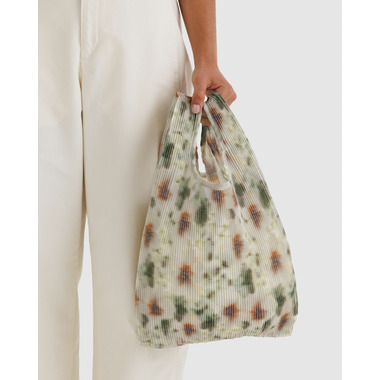 A smaller version of the original reusable shopping bag, dressed up with pleats. Perfect for errands, evenings out, and everything in between. Holds up to 30 lbs. Folds into a matching drawstring pouch. Machine washable.