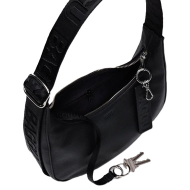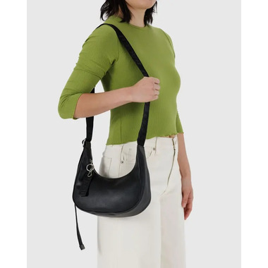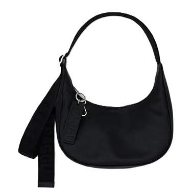 BAGGU's smaller crescent shape in recycled leather. Elevated, durable, and designed to fit the essentials. Features an interior zip pocket and thoughtful additions like a key leash and debossed keychain.