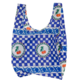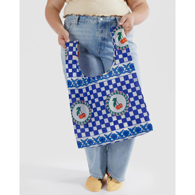 your shoulder. Holds 2-3 plastic grocery bags worth of stuff. Folds