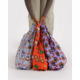 A set of Standard Baggus in a reusable drawstring pouch. Each set contains three unique prints, ideal for gifting. Each bag carries 2-3 plastic grocery bags worth of stuff comfortably in hand or over your shoulder. Each holds up to 50lbs. Each folds into its own flat 5" 5" pouch. Made from recycled ripstop nylon. Machine washable.