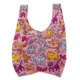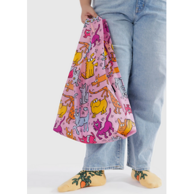 your shoulder. Holds 2-3 plastic grocery bags worth of stuff. Folds