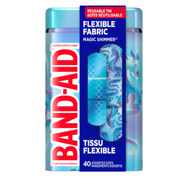 Cover and protect minor cuts, scrapes, burns, and wounds from dirt and germs and express your personal style with designer BAND-AID Brand Flexible Fabric Adhesive Bandages with a decorative Magic Shimmer design. Designed to cushion painful wounds while they heal, these colorful flexible fabric bandages from the #1 doctor-recommended brand of adhesive bandages are made with a protective Quilt-Aid comfort pad that won't stick to the wound for gentle removal.
