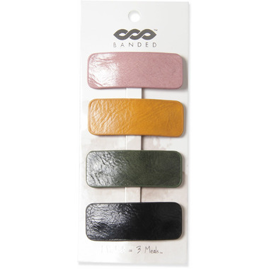 Faux leather snap barrettes in pink, gold, green & black (1 ea color); Modern rounded rectangles sit flat again hair & fasten with an easy snap.