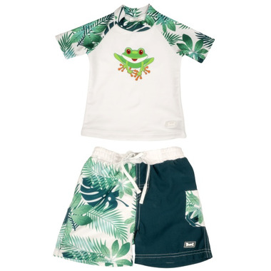 This stylish swimsuit from Banz offers great sun protection for little sunbathers. The suit fits loosely to keep little ones comfortable, but has three-quarter length sleeves and a high UV rating that offer full protection. With two pieces, this set is less restrictive for older children than traditional one-piece suits.