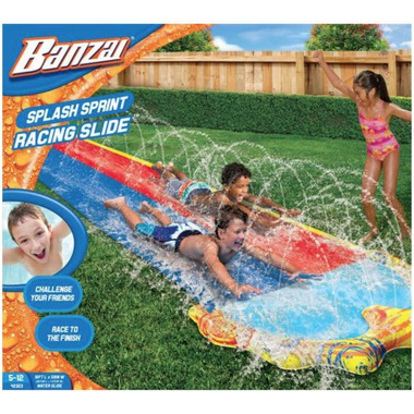 Test your own speed or challenge your friends to cross the finish-line first with a water slide in your own back yard! This 16 foot water slide has water-spraying bumpers, two racing lanes and a splash pool. Dual-lane racing slide easily connects to any standard garden hose.