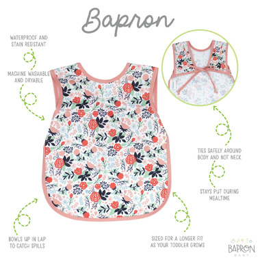 BapronBaby Baprons feature secure horizontal ties that offer a snug, comfortable fit, preventing slips and spills - even for babies that usually hate bibs. Crafted from durable yet soft waterproof fabric, they are quick-drying, stain-resistant, and machine washable. Plus, they are made from 100% certified baby-safe materials, free from harmful chemicals, ensuring they are gentle on even the most sensitive skin.