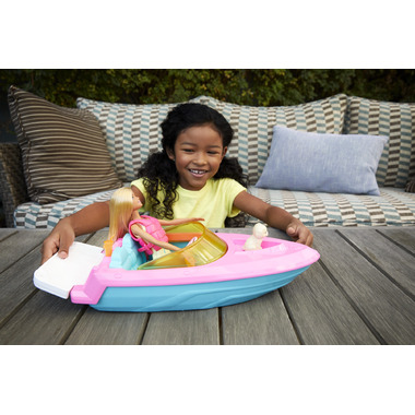 Inspire travel adventures with Barbie doll, her pet puppy and a boat that floats in water! With a colorful design and room for 3 dolls, this Barbie speedboat sparks endless sea-inspired stories (other dolls sold separately). Slip the hot-pink life vest over Barbie doll's colorful swimsuit, then hit the water! Park the boat to lounge with cupholders and plug-and-play beverage accessories. Barbie doll's adorable pet puppy is along for the ride -- there's a special seat on the bow!