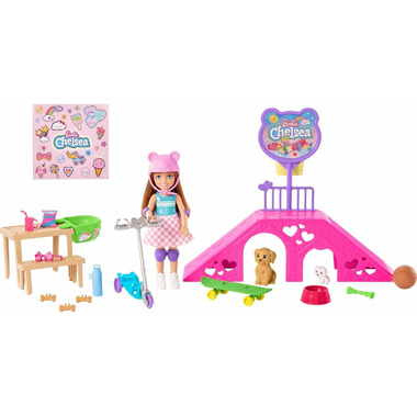 - Chelsea doll and her two puppies are headed to the skatepark with this Barbie playset that includes a skate ramp, picnic area, basketball hoop and 15+ accessories!