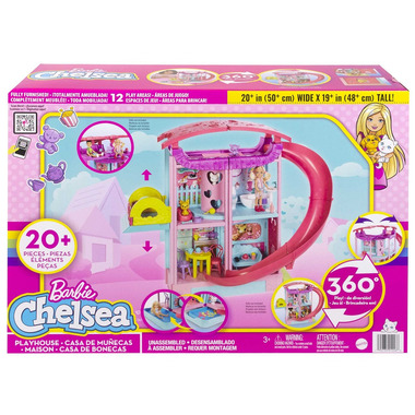 Chelsea doll and her friends have their own playhouse -- and with three levels, so many play spaces and a transformation feature that unlocks secret play areas, it opens the door to endless playtime possibilities! Sized just right for 6-inch Chelsea dolls (sold separately), this dollhouse features a living room and kitchen on the first floor, pet room and bathroom on the second, and a rooftop bedroom at the very top, all accessible to Chelsea doll with the working elevator. When kids transform the playhouse, they'll reveal a secret pet room, balcony for two and a pool that flips over to reveal a ball pit!