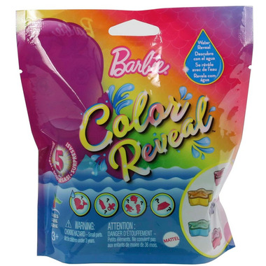 Barbie Colour Reveal mermaid baby dolls deliver an unboxing experience full of surprises -- five of them, including a pet! A sweet mermaid baby figure is guaranteed, but its look remains a mystery until revealed. Open the starfish-shaped case and remove the mermaid baby doll covered in Colour Reveal sea blue and three mystery bags. Fill the case with warm water, then reveal the baby doll by dipping and swirling it within! Part of the Colour Reveal Rainbow Mermaid Series, each doll represents a different colour of the rainbow. Open the three bags to find a pet friend, colourful skirt and a baby bottle or pacifier. The starfish-shaped case has a built-in play area for the mermaid baby and pet, plus Chelsea doll (sold separately). Store everything inside the case when playtime is over. What will you reveal?ٙ Kids can collect them to mix and match accessories and expand the possibilities! Each sold separately, subject to availability. Colours and decorations may vary.