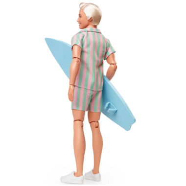 Take home a part of Barbie The Movie with this Ken doll! Dressed in a surf-casual outfit, he is having the best day ever in Barbie Land! Ken doll rocks a pastel pink and mint green striped top. The matching shorts even feature working pockets. He looks as easy and breezy as film Ken with his surfboard, platinum blond hair, unbuttoned top, and white sneakers.