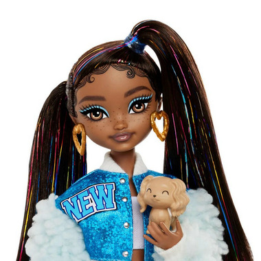 - Doll is posable and wearing removable fashions, like her sparkly varsity jacket, denim skirt, leg warmers, and heels!