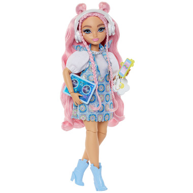 The Barbie Dream Besties Barbie Daisy Jean doll shows that when you share your unique talents with the world, anything is possible! Daisy Jean dreams of owning a music label and performing at the biggest music festival in the world! She comes with themed accessories like a DJ tablet, headphones, phone, cotton candy, and daisy-themed necklace, phone case and purse Doll is posable and wearing removable fashions, like her metallic crochet dress, layered over her white puffed-sleeve top, and blue cowboy boots! Daisy Jean doll features long pink hair, styled in space buns and braids to showcase the character's creative personality! The doll set makes a great gift for kids 4 years old and up, especially those who love dancing and styling!