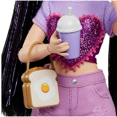 • Doll is posable and wearing removable fashions, like her sparkly purple-heart crop top, purple denim shorts and boots!