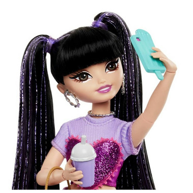 • Renee doll features long black hair, styled in pigtails, with shiny purple highlights to showcase her enthusiastic personality!