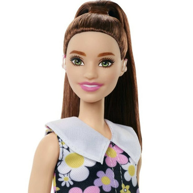 - Barbie-doll has a smaller bust and wears a daisy print shift dress featuring an oversized collar. Pink boots finish the playful yet modern look.