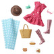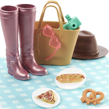 Includes: 1 dress, 1 pair of boots, 1 hat, 1 pair of sunglasses, 1 blanket, 1 bag and 3 food pieces.