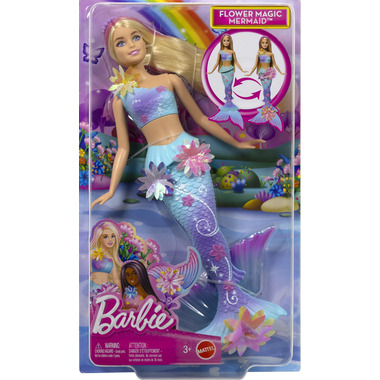 Blossom into fun with Barbie Flower Magic Mermaid doll! Slide the lever on her back to see flowers magically "bloom" from her bodice to her fins, over and over again! Kids can play with these dolls on land and in water for a beautiful blossoming display under the sun or sea. With her iridescent flowers, ombre fins, and pearl headband accessory in her gorgeous long blonde hair with pink highlights this Barbie mermaid doll is as enchanting as an undersea garden. Doll cannot stand or swim alone. Colors and decorations may vary.