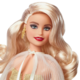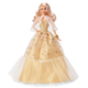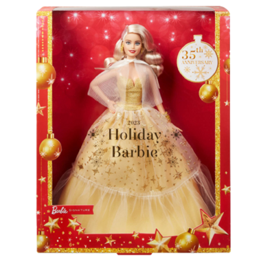 Marking the 35th anniversary of Holiday Barbie, this elegant doll shines with all the good will and brightness of the season. Her champagne-coloured satiny dress features a tulle skirt overlay that shimmers with gold stars. A pleated sheer cape ties at the neck with an ivory satin ribbon, while golden statement earrings and a sculpted golden wrist cuff add seasonal sparkle.