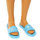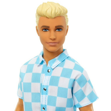 • Ken doll wears a blue and white checkered button down with matching sky-blue swim trunks. His glossy blue slides sport a Ken; logo detail!
