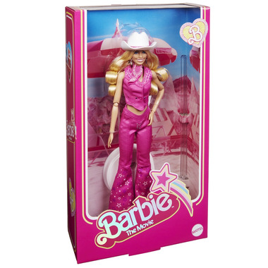 ?Greetings from Barbie Land! This collectible Barbie doll turns heads in her all-pink look modeled after Barbie's western outfit in Barbie The Movie. She wears a matching denim vest and flare jeans with a cowboy hat and boots. In the likeness of Margot Robbie as Barbie, she makes a great gift for fans and collectors alike! Doll stand included. Doll cannot stand alone. Colors and decorations may vary.