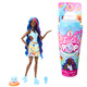 Barbie Pop Reveal dolls offer an unboxing experience filled with eight sensory surprises! Which doll will you reveal? Unwrap the drink cup-inspired packaging to find one of four flavors in the Fruit Series -- strawberry lemonade, fruit punch, watermelon crush or grape fizz. Open the lid and remove the surprise bags, then pop the top and watch colorful Slime drip down over the ice cubes that hold accessories inside. Kids can take the squishy Slime out for fun, sensory play. Next, pop the ice cubes to find roller skates and a squishy mini-drink piece. The ice cubes are reusable -- repeat the pop reveal fun again and again! Kids keep unboxing to find a fruit-scented fashion doll, a squishy and scented pet, fashion piece and accessories. Each Pop Reveal Barbie doll is posable with color-change hair and makeup. Kids will want to collect them all! Each doll sold separately, subject to availability. Dolls cannot stand alone. Colors and decorations may vary.