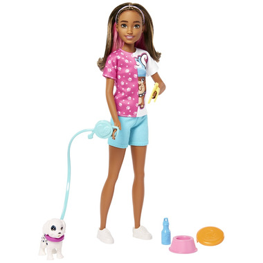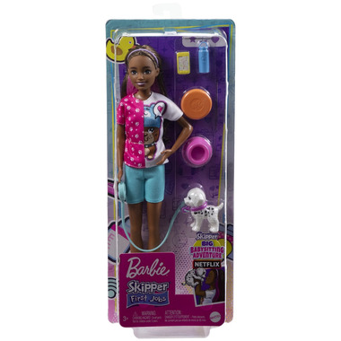 Barbie Skipper First Jobs dolls and playsets let kids explore the working world with the teenaged sister of Barbie. Inspired by the Skipper and the Big Babysitting Adventure movie, this playset builds Skipper doll's resume with a job as a dog walker. Imaginations can engage in role-play with an adorable puppy and five accessories! Doll cannot stand alone. Colors and decorations may vary.